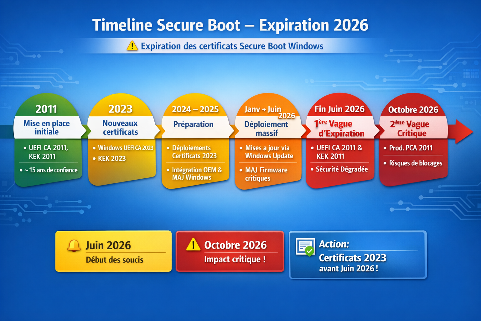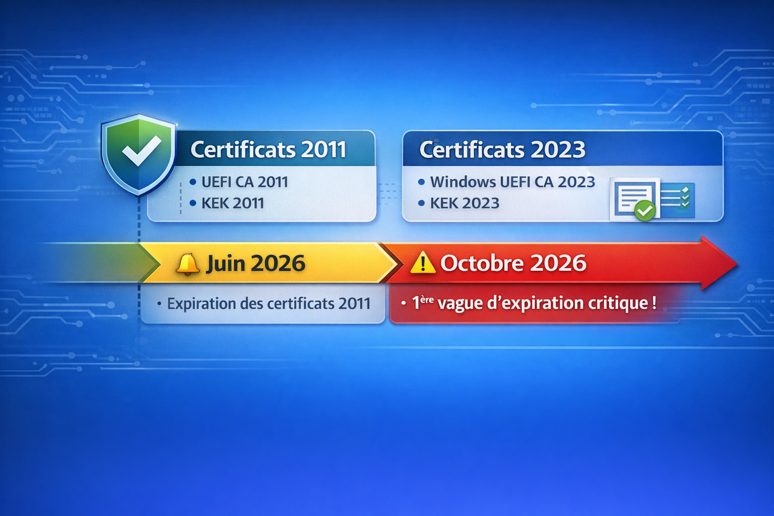 Vous avez probablement déjà vu passer les communications Microsoft sur la mise à jour des certificats Secure Boot avant juin 2026. Et comme souvent avec ce type de sujet, la première réaction peut vite être l’une de celles-ci : “j’ai encore un peu de temps” ou au contraire “par où commencer ?”.