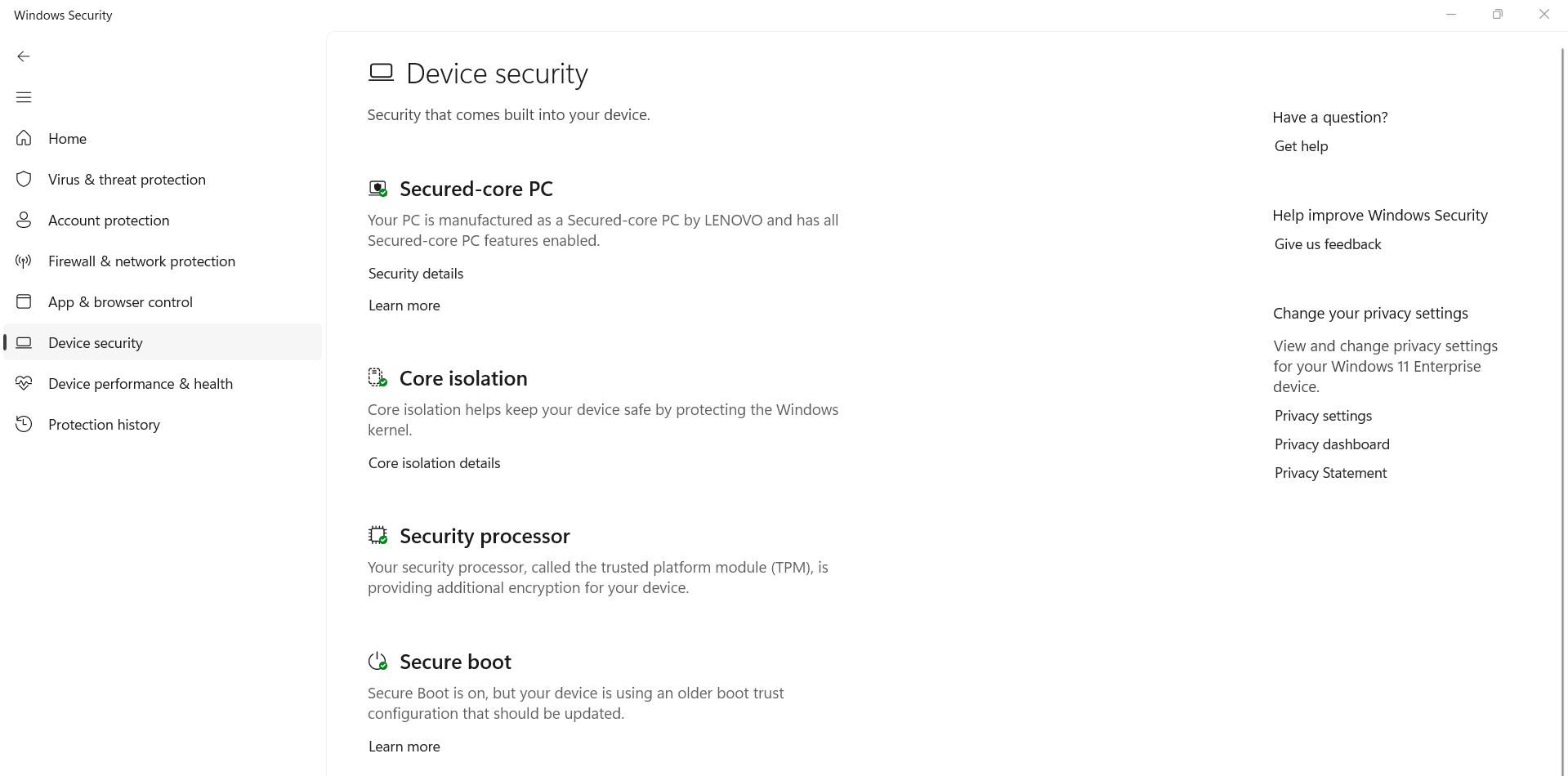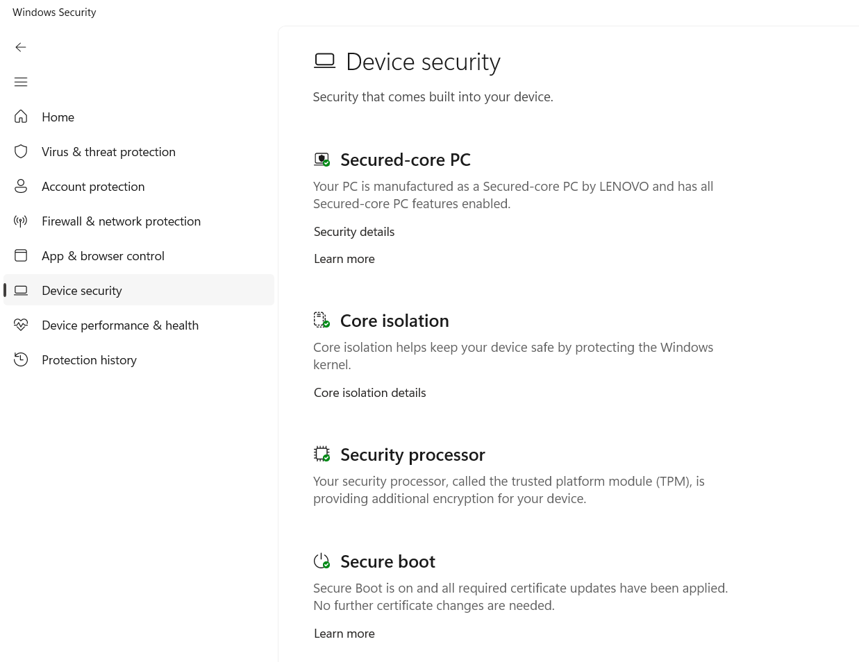Windows affiche aussi des informations de statut dans Windows Security > Device security. Sur les devices Enterprise gérés, cet affichage n’est pas toujours visible par défaut.