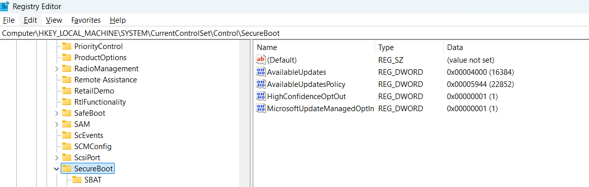 HKLM\SYSTEM\CurrentControlSet\Control\SecureBoot