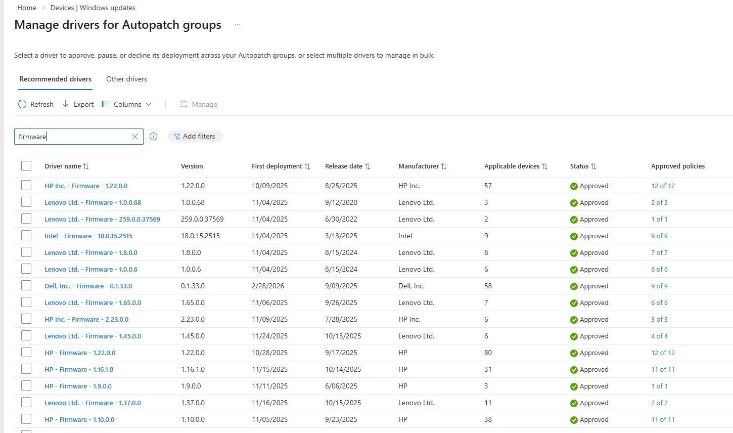 Lorsque vos appareils Windows utilise déjà Windows Update for Business ou Autopatch, il est généralement plus judicieux d’opter pour Driver Updates. Cette solution s’avère souvent la plus simple et efficace, puisque le système Windows Update fonctionne déjà.