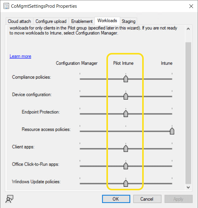 Si l’objectif est de pousser la configuration depuis Intune, le workload doit être déplacé vers Pilot Intune ou vers l’état approprié selon le modèle retenu, et le device doit bien faire partie de la pilot collection.