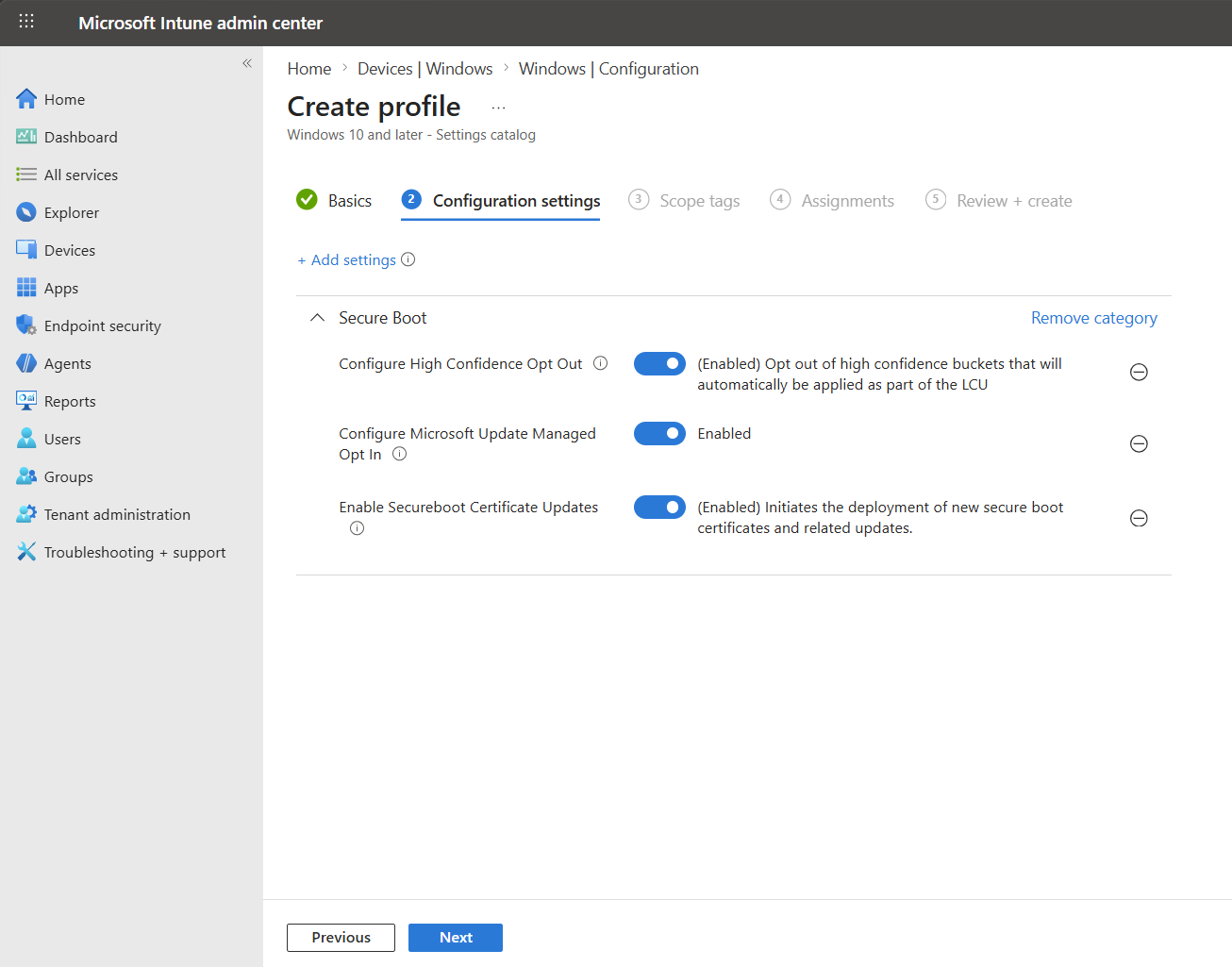 Microsoft a ajouté des réglages dédiés dans le Settings Catalog. Les trois paramètres à connaître sont :